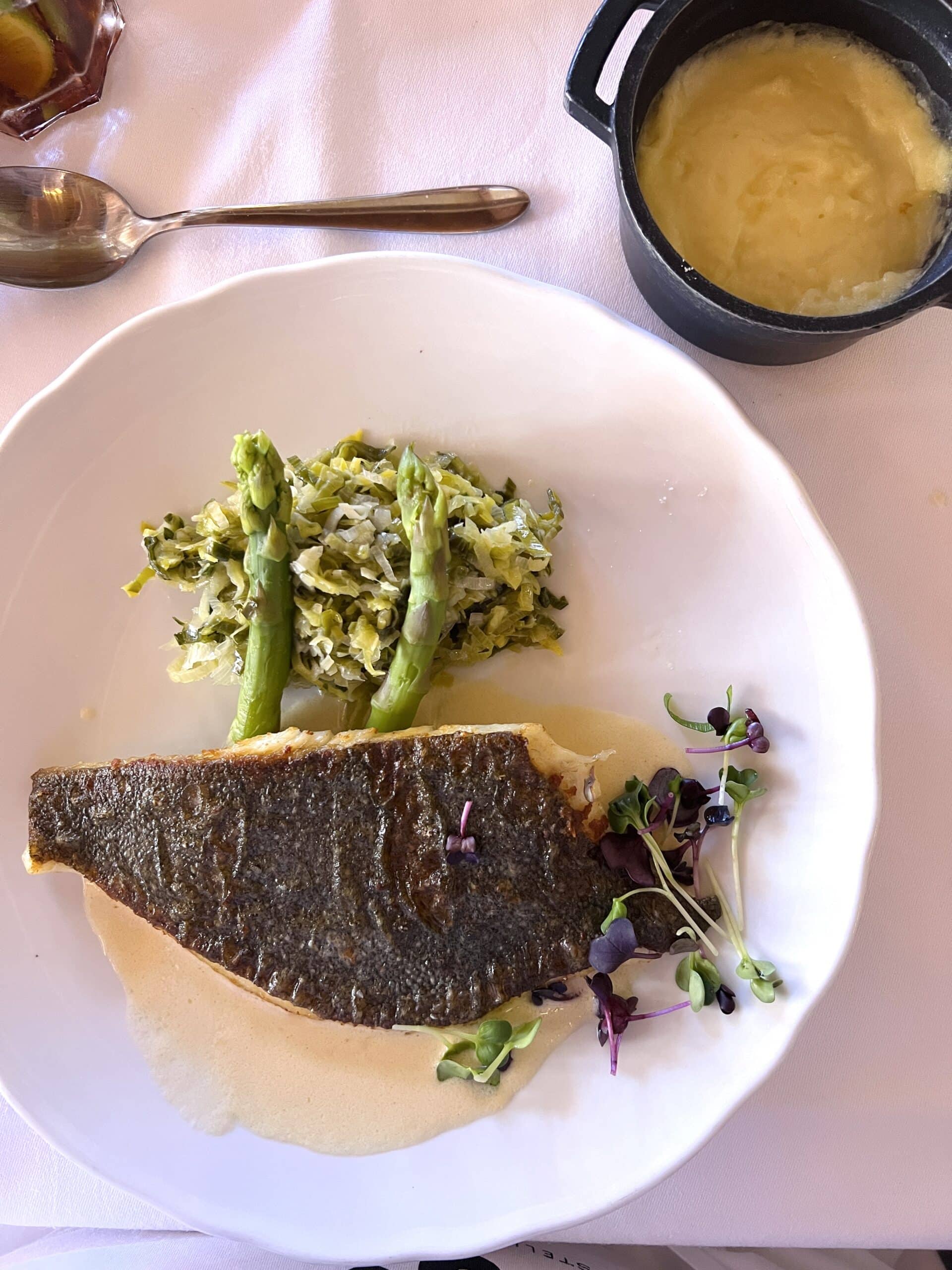 Niveau plat, le filet de Turbot doré sauce champagne, étuvée de poireaux et asperges vertes pour moi et fondant de bœuf sauce vin rouge, carottes glacées et crème truffée pour mon homme. Les 2 plats étaient copieux également, bien assaisonnés, joliment dressés.