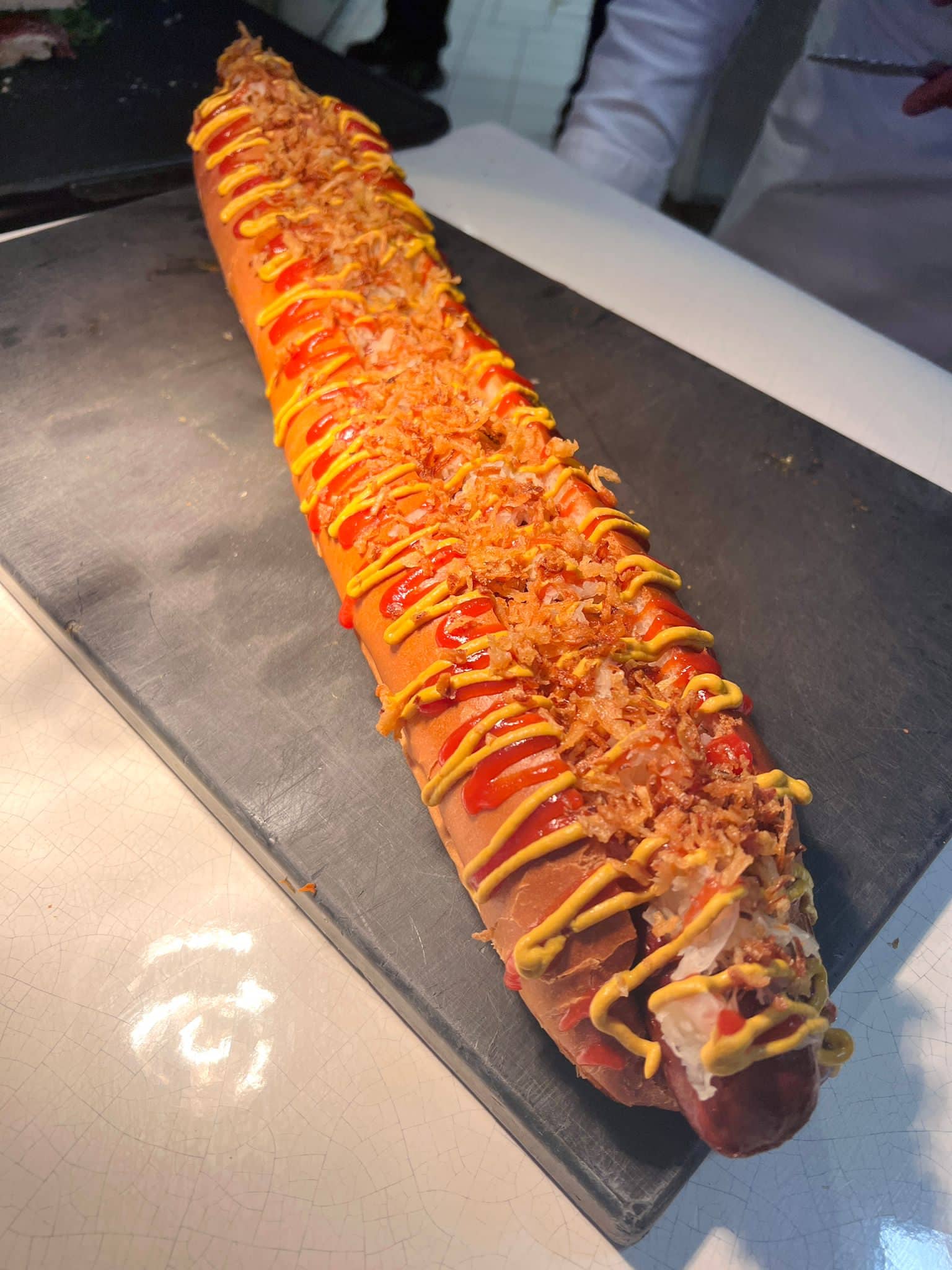 Niveau plat, coup de cœur pour le burger version géant dont vous pourrez déguster une part coupée directement devant vous, les corndog, les pâtes préparées devant vous.