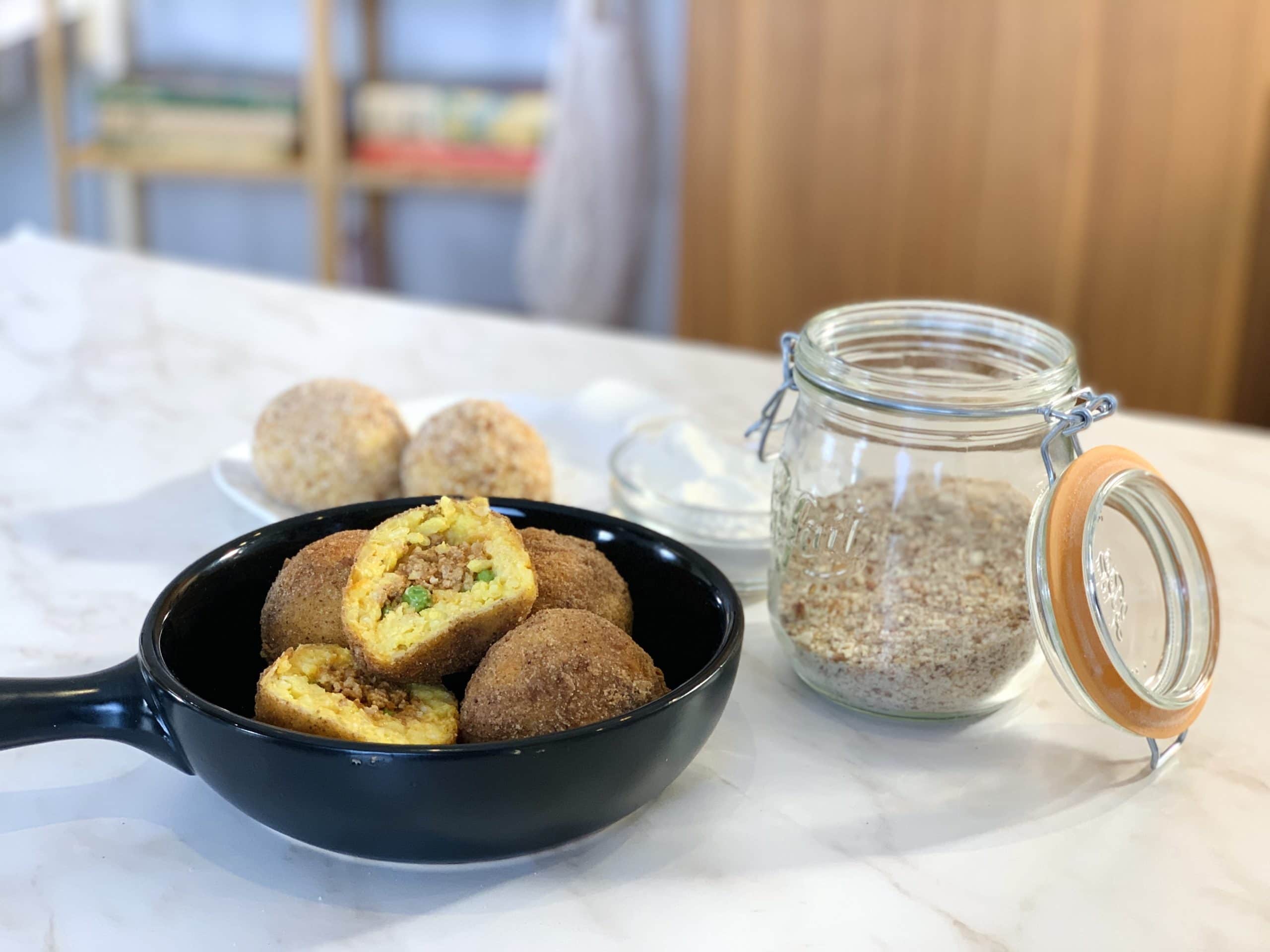 Les arancini, spécialité de Sicile, sont des boulettes de riz panées et fourrées d’une farce de petits pois.