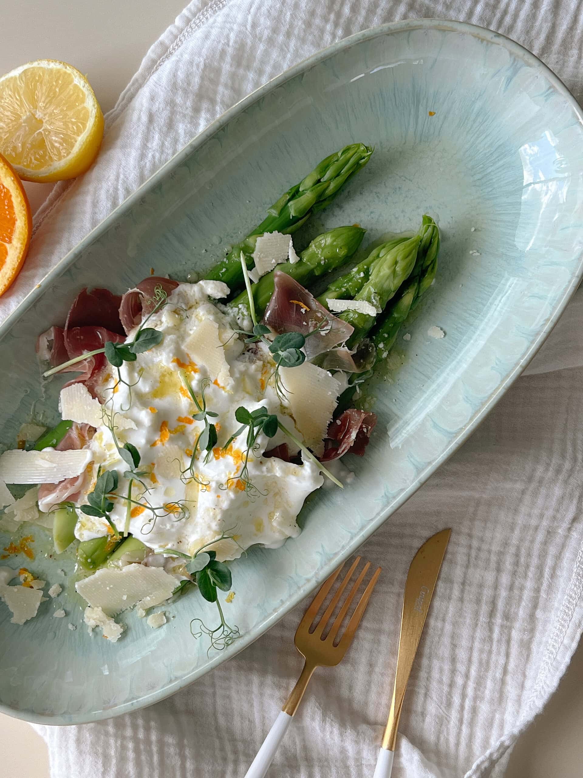 Asperges vertes, burrata et vinaigrette aux agrumes