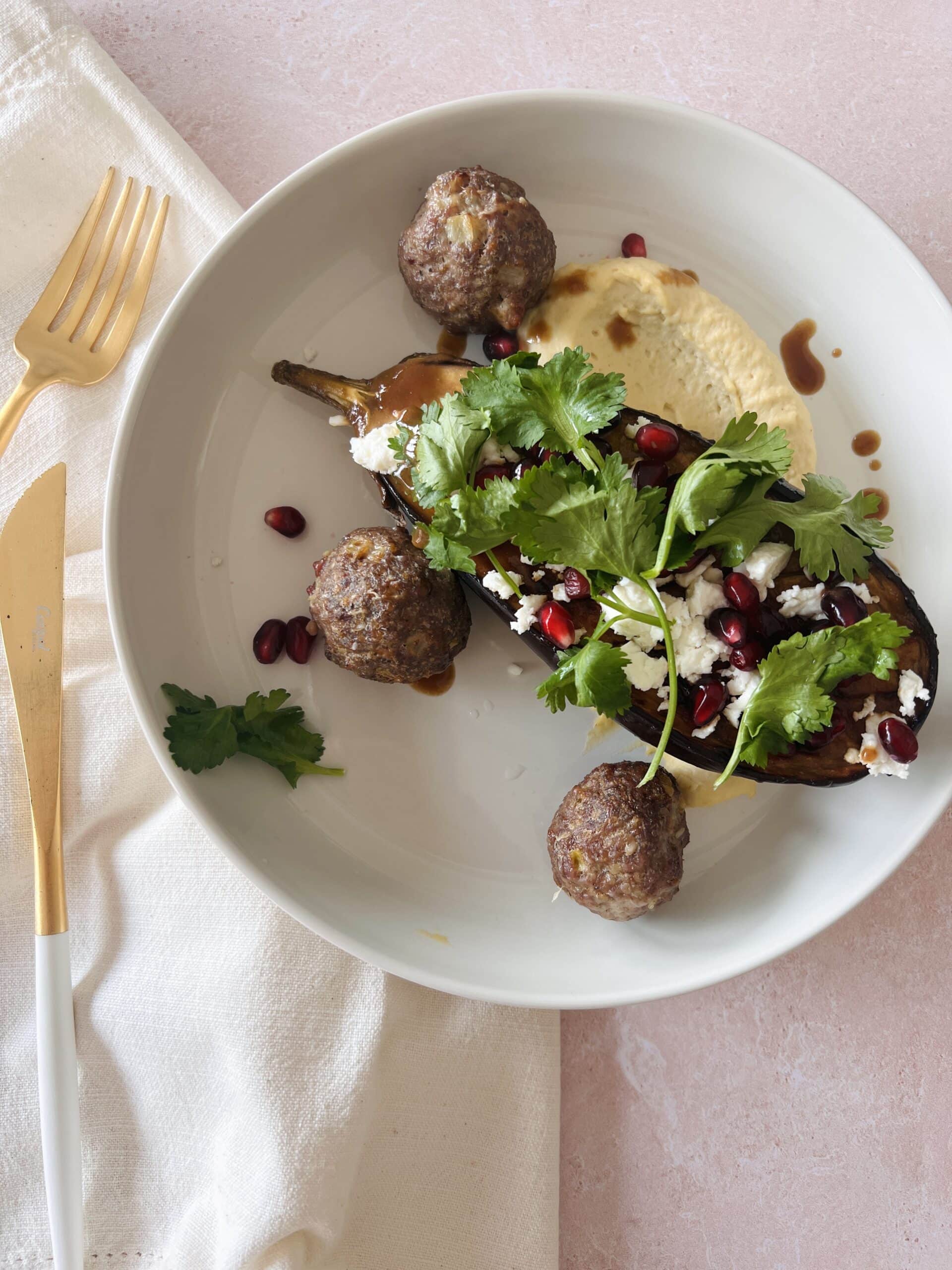 Aubergines rôties au miso, houmous et boulettes de bœuf