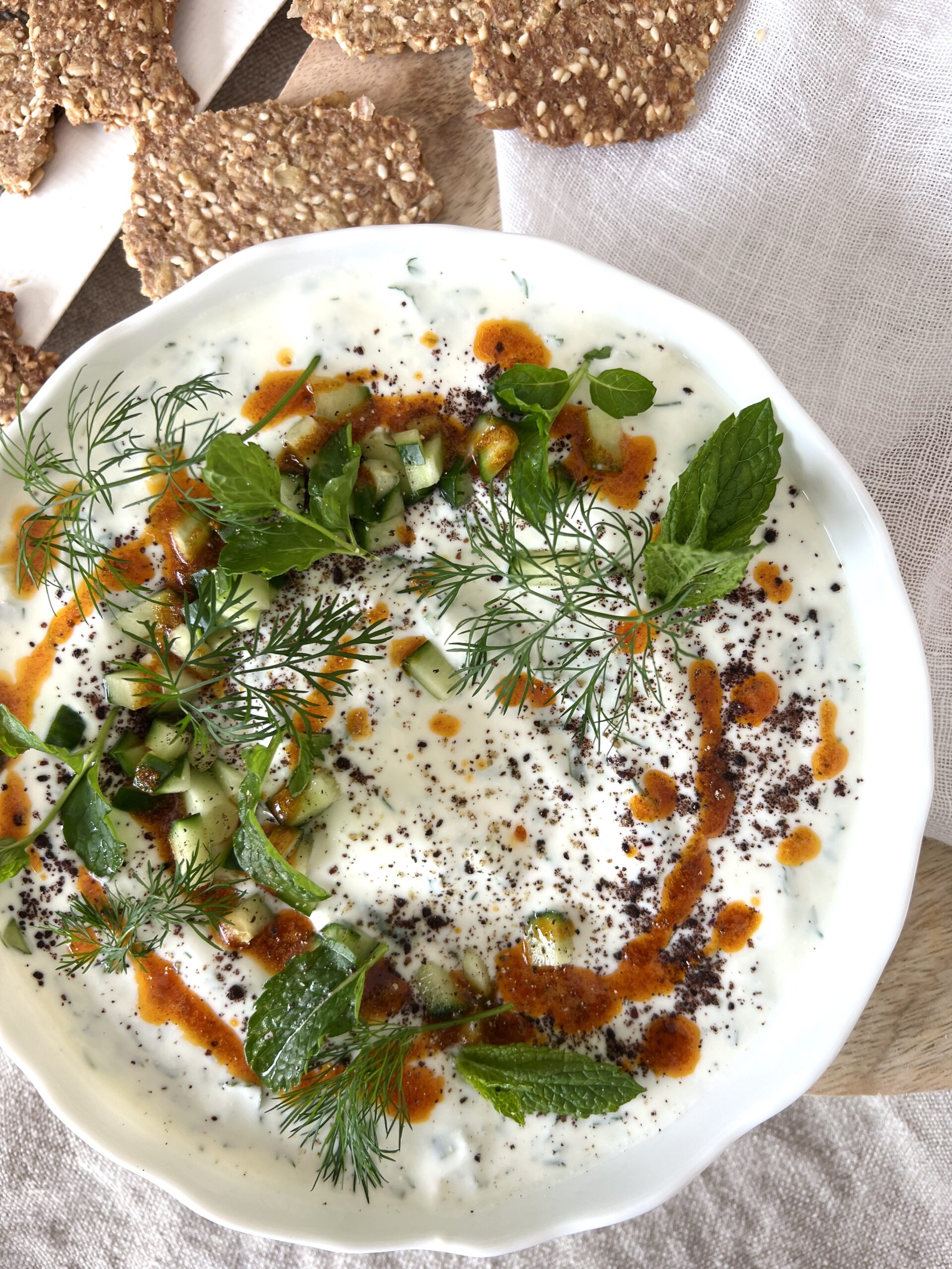 - Dans une belle assiette creuse, verser le yaourt, garnir avec le concombre, les herbes et un filet d’huile d’olive.