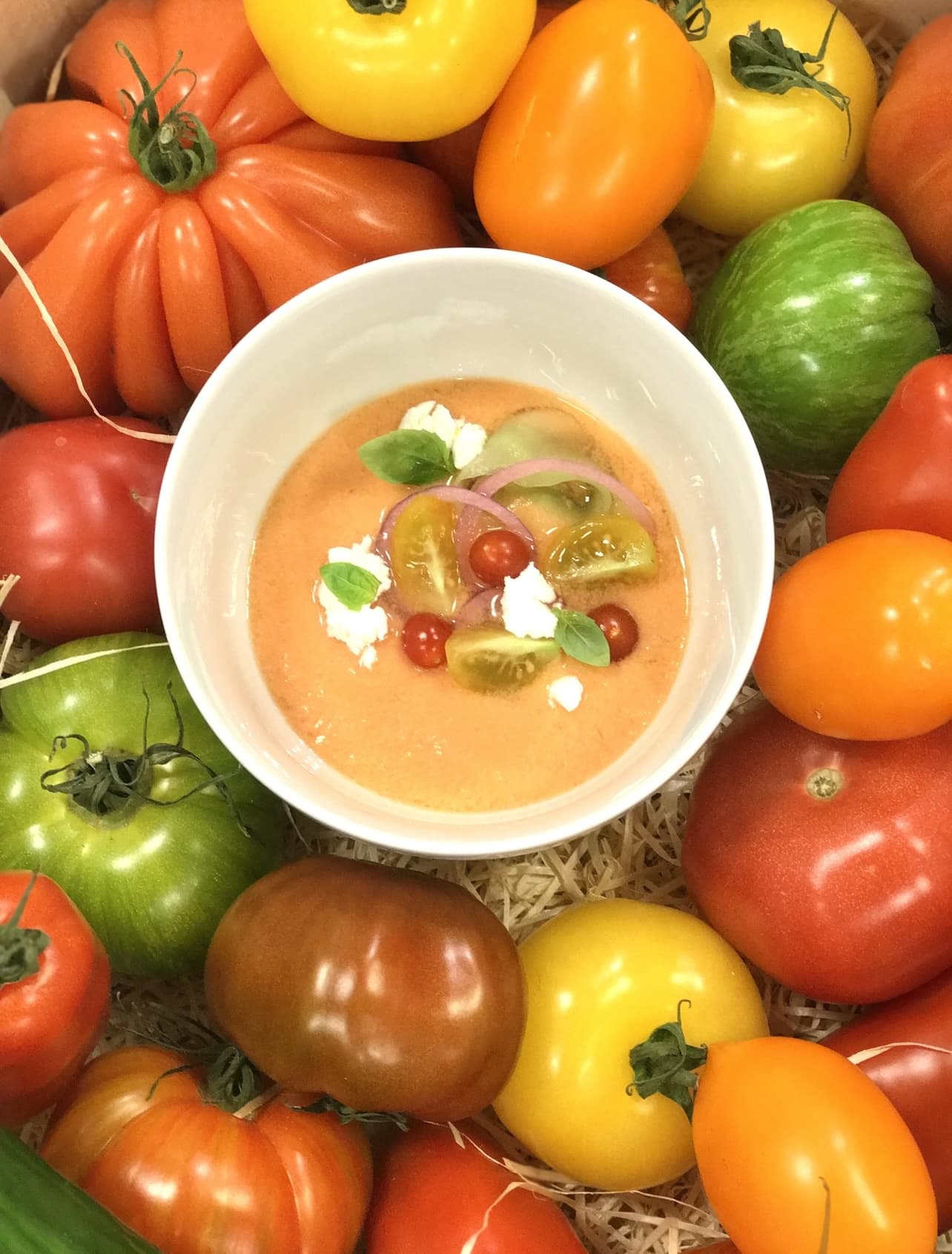Le gaspacho est un grand classique de la cuisine espagnole ! Je vous propose ma version avec du fromage de chèvre et du basilic !