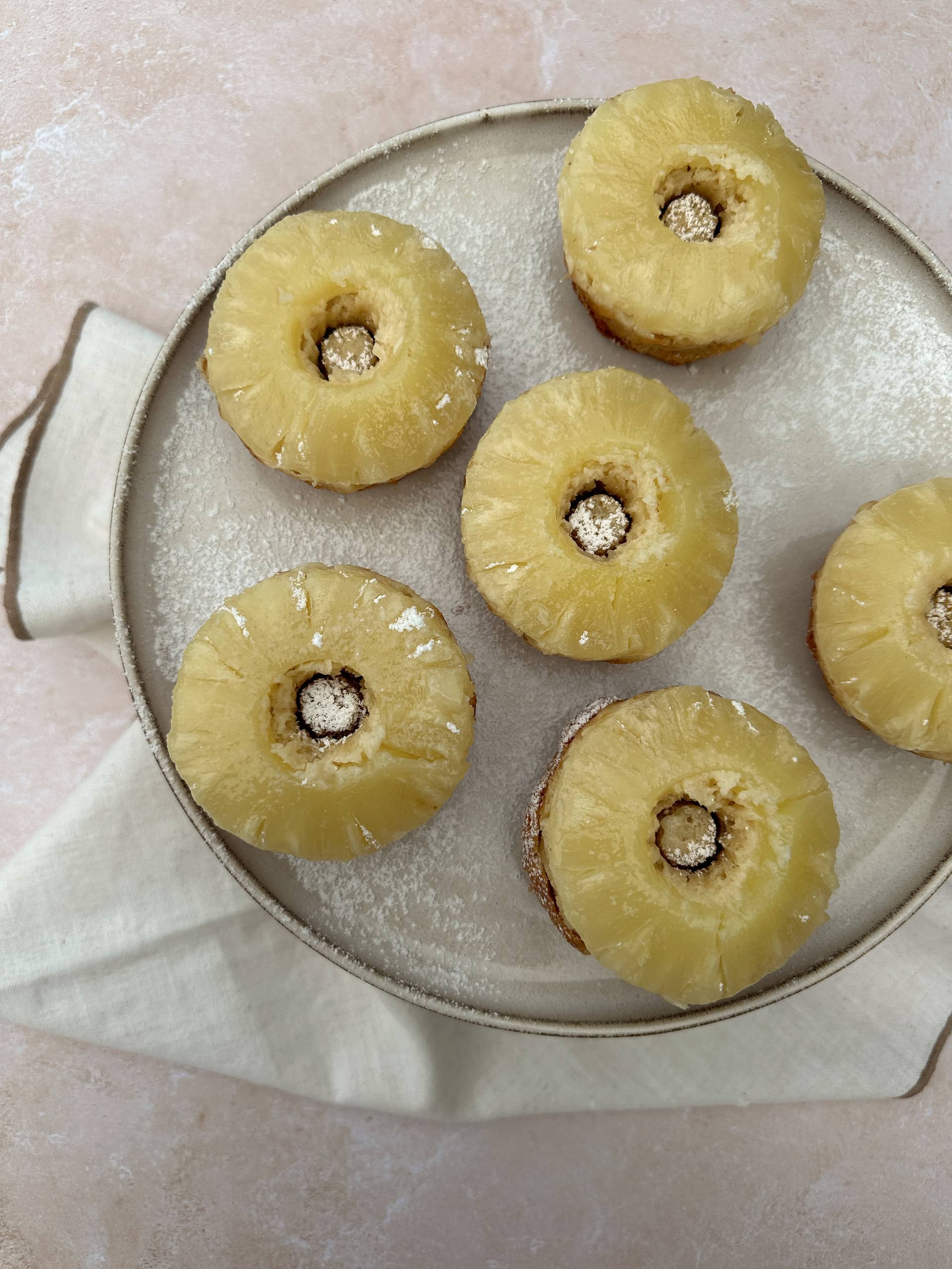 - Garnir le fond de vos moules d’une tranche d’ananas, puis verser l’appareil par-dessus.