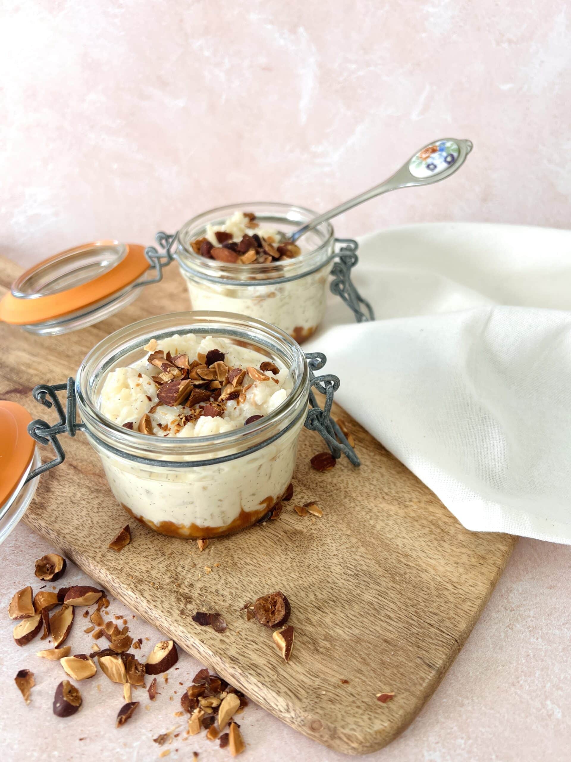 • Garnir le fond d’un pot avec du caramel beurre salé. Remplir de riz au lait. Déposer par-dessus des noisettes et des amandes torréfiées.
