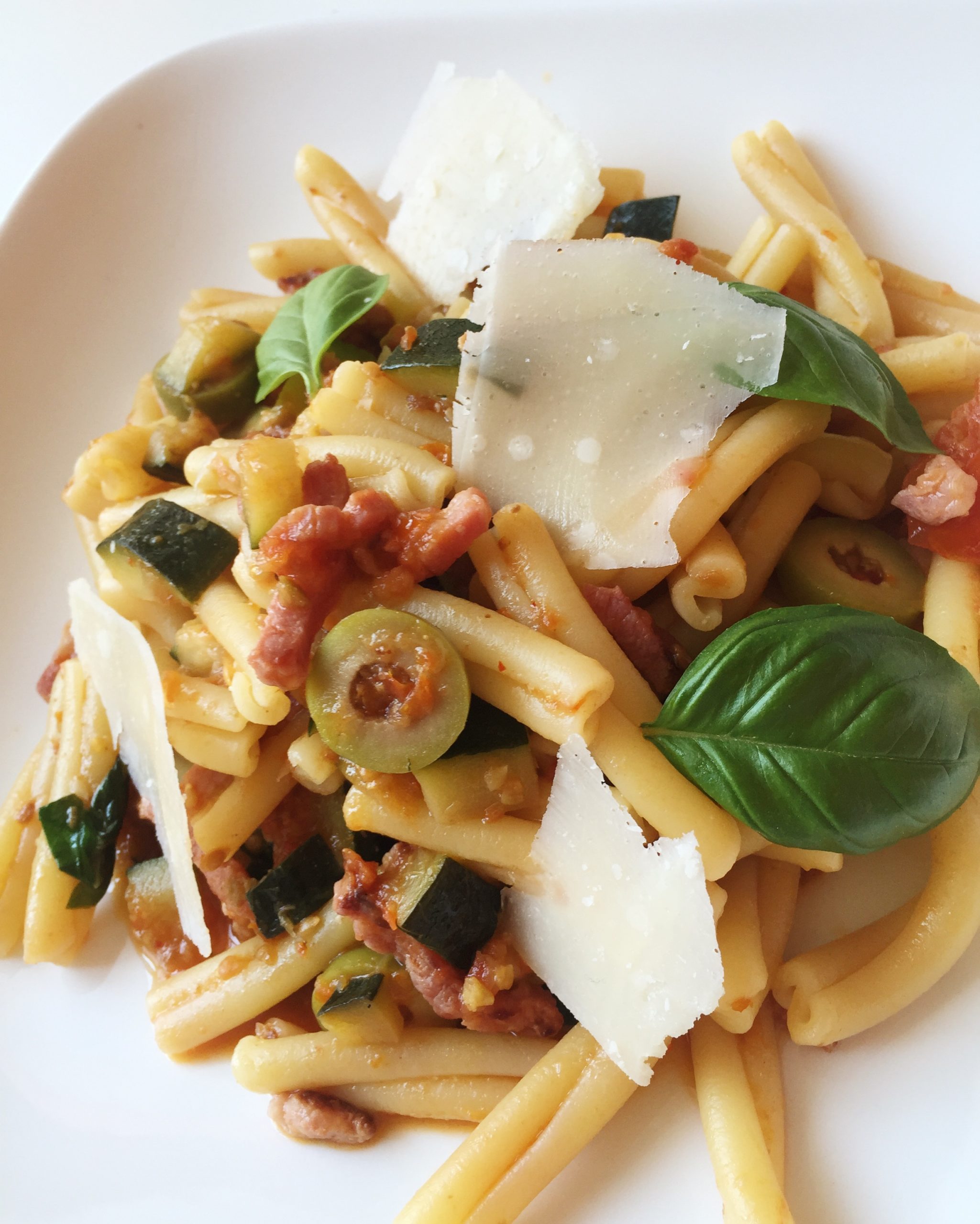 Mots clés : courgette, lardons, olive, pâtes, pates