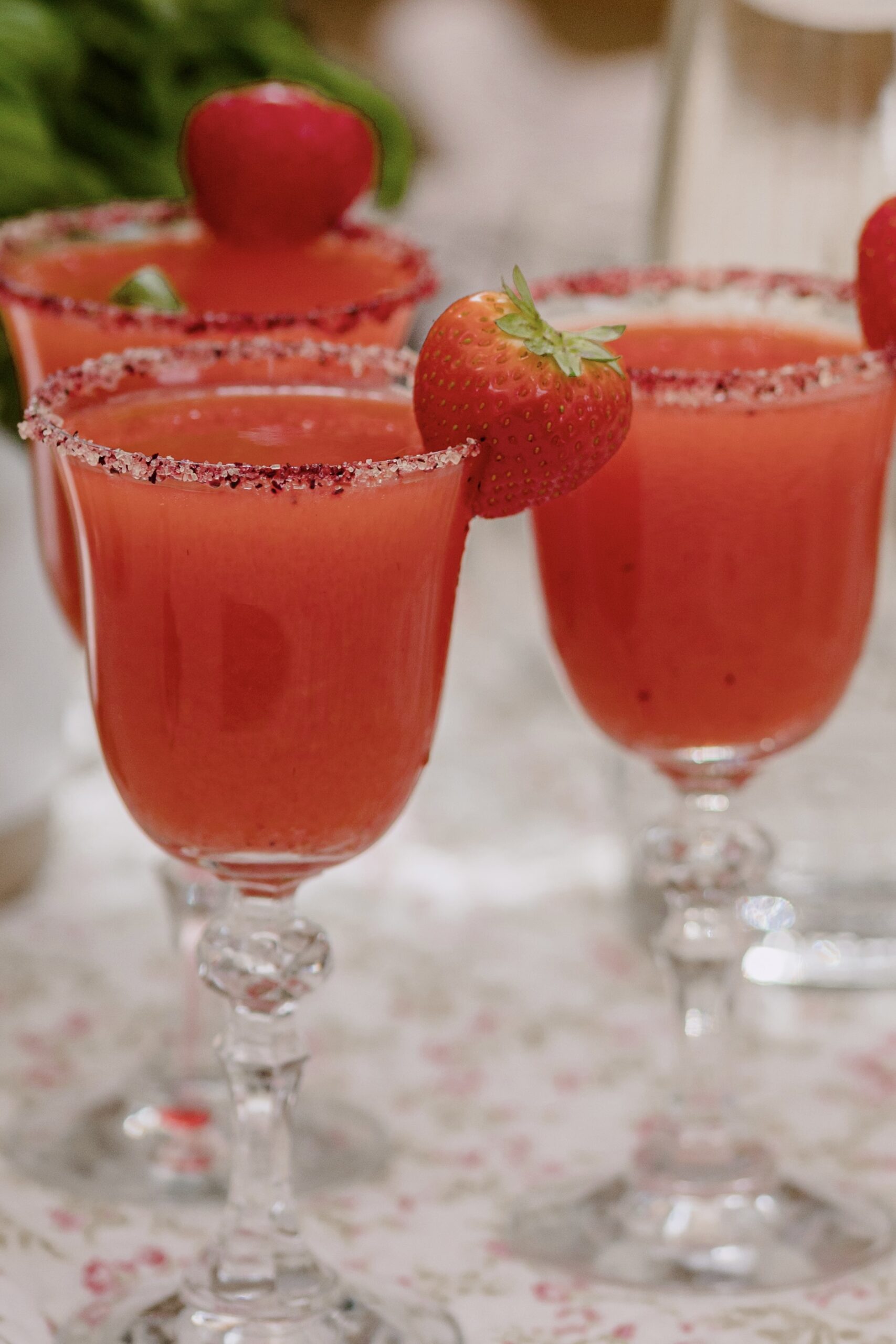 - Verser l’infusion d’hibiscus, les fraises et 25 cl de sirop de basilic dans un blender et quelques glaçons.