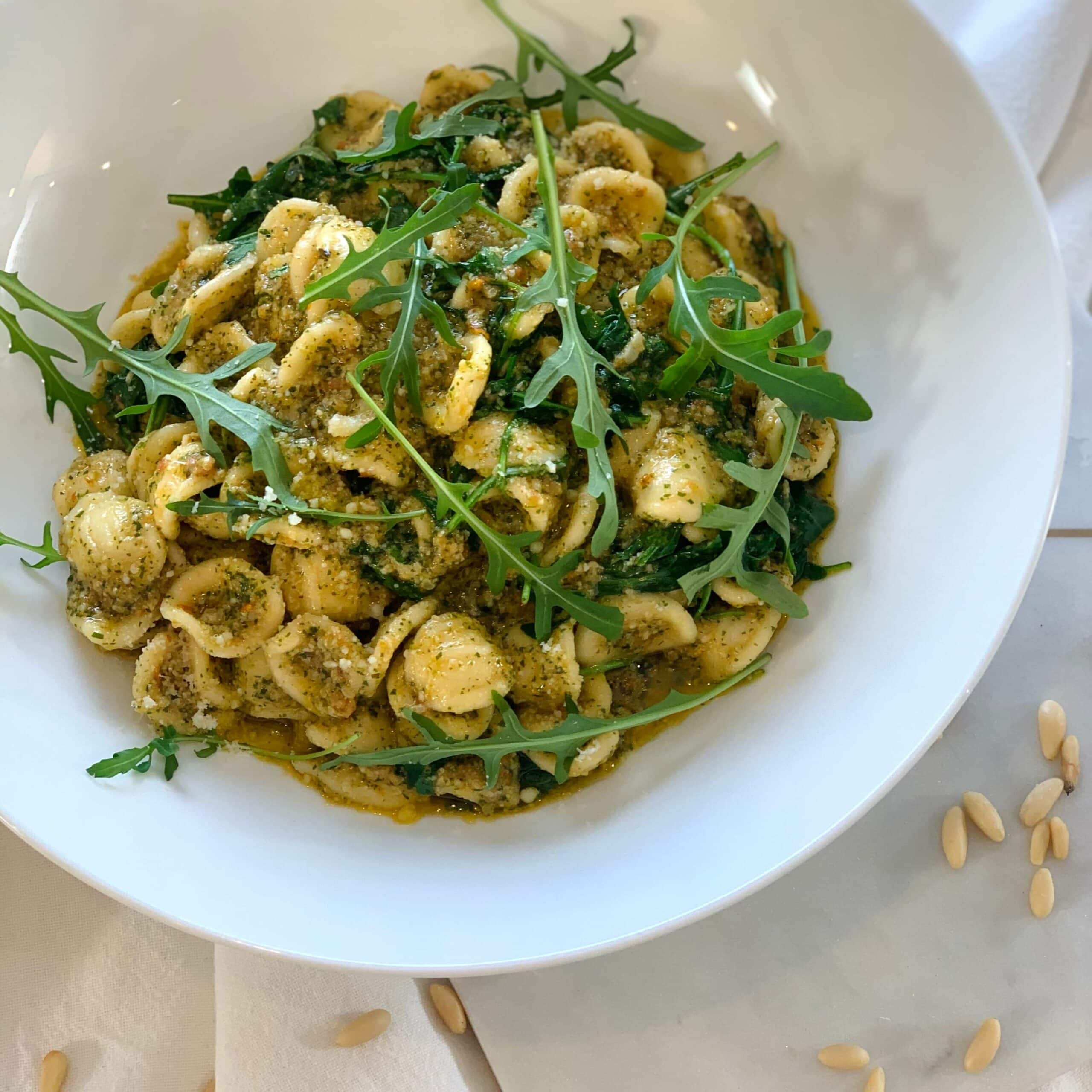 Orecchiette, pesto de roquette, tomates confites et parmesan