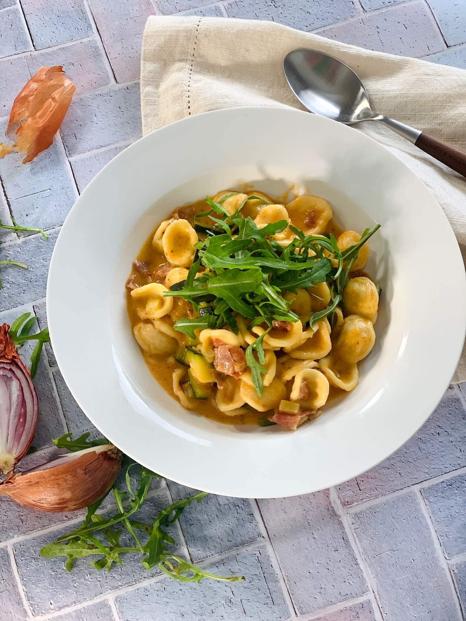 Une fois de plus, vendredi, c’est le jour de la gourmandise assumée dans ma cuisine. Et cette semaine, en matière de pâtes, j’ai opté pour ces petites pâtes rondes au nom évocateur: des orechiette dans une sauce onctueuse ! Accompagnées d’un pesto de tomates, de chèvre et de roquette, elles feront fureur !