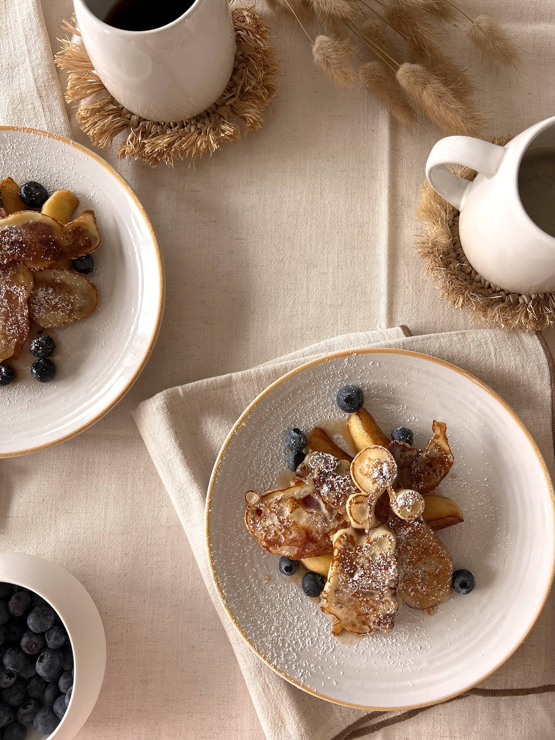 - Dresser les pommes, des pancakes bacon et saupoudrer de sucre glace.