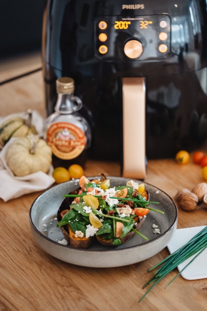 (Si vous avez envie de viande, vous pouvez ajouter 2 tranches de bacon par personne que vous ferez cuire 5 minutes à 200° sur la grille de votre Airfryer après les patates douces)