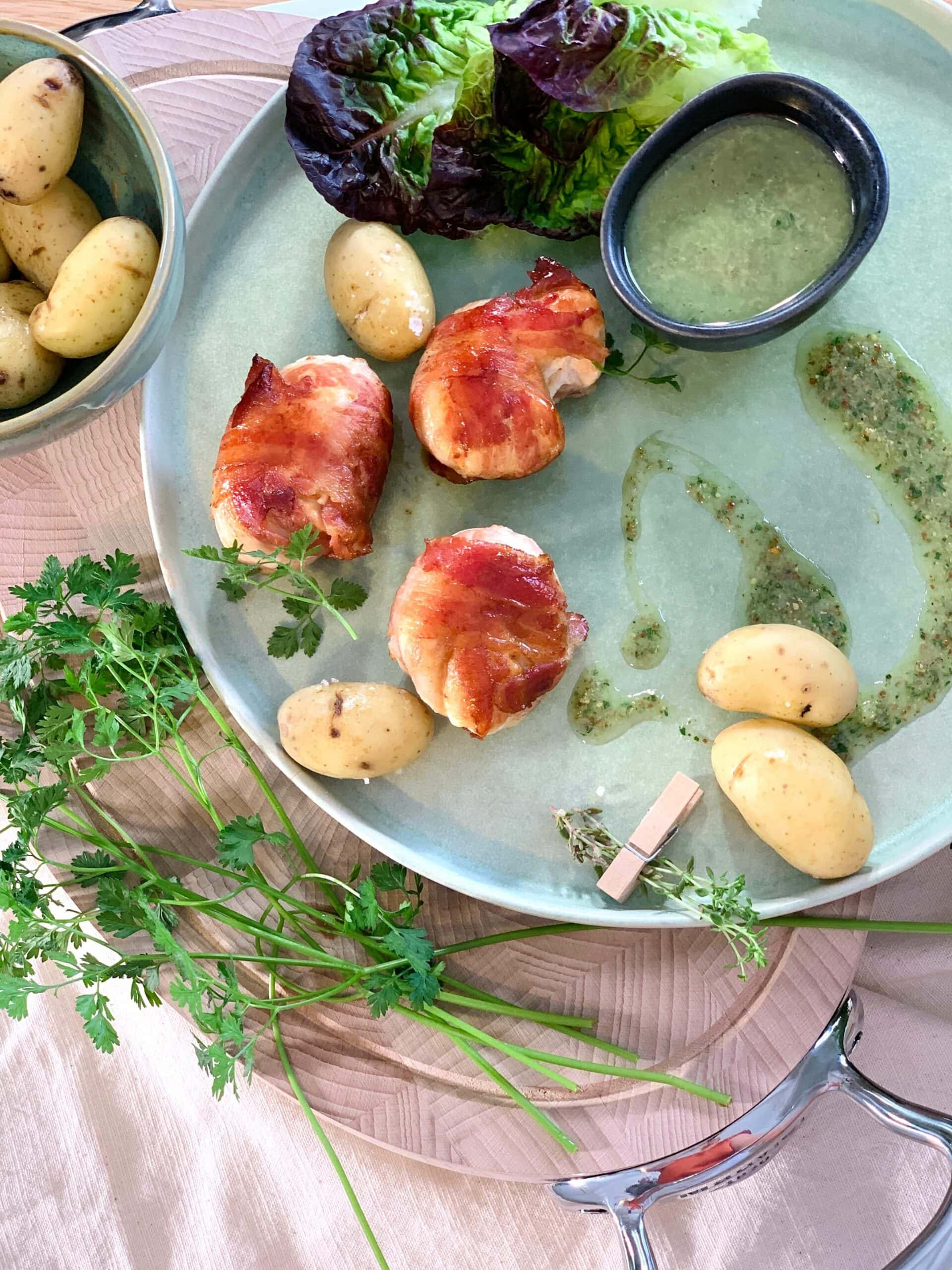 Poulet bardé de lard, sauce ravigote et pommes de terre grenaille