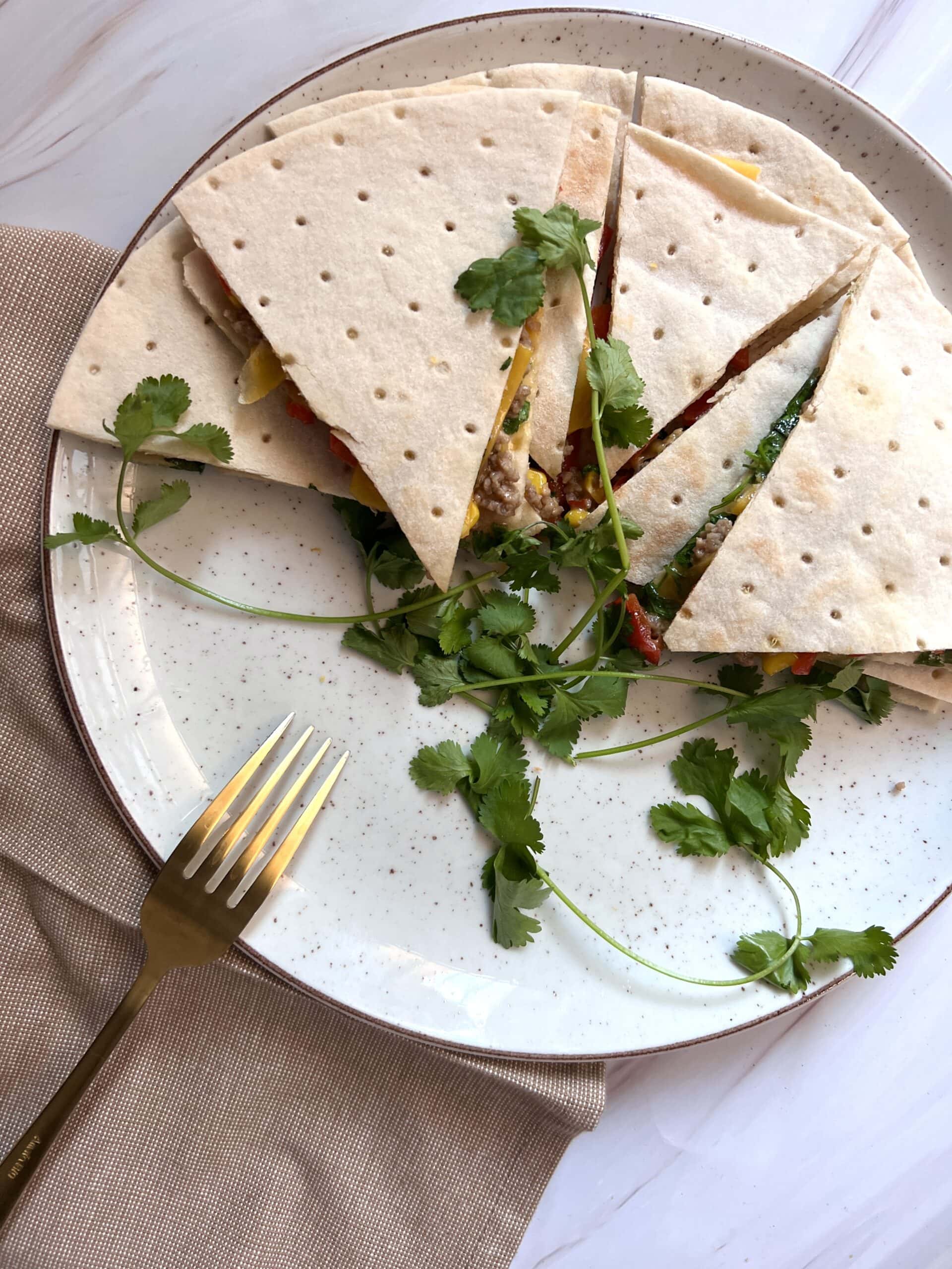 - Déposer le mélange de bœuf et légumes sur ½ tortilla et recouvrir de cheddar. Faire cuire 1 à 2 minutes de chaque côté. Le fromage doit fondre.