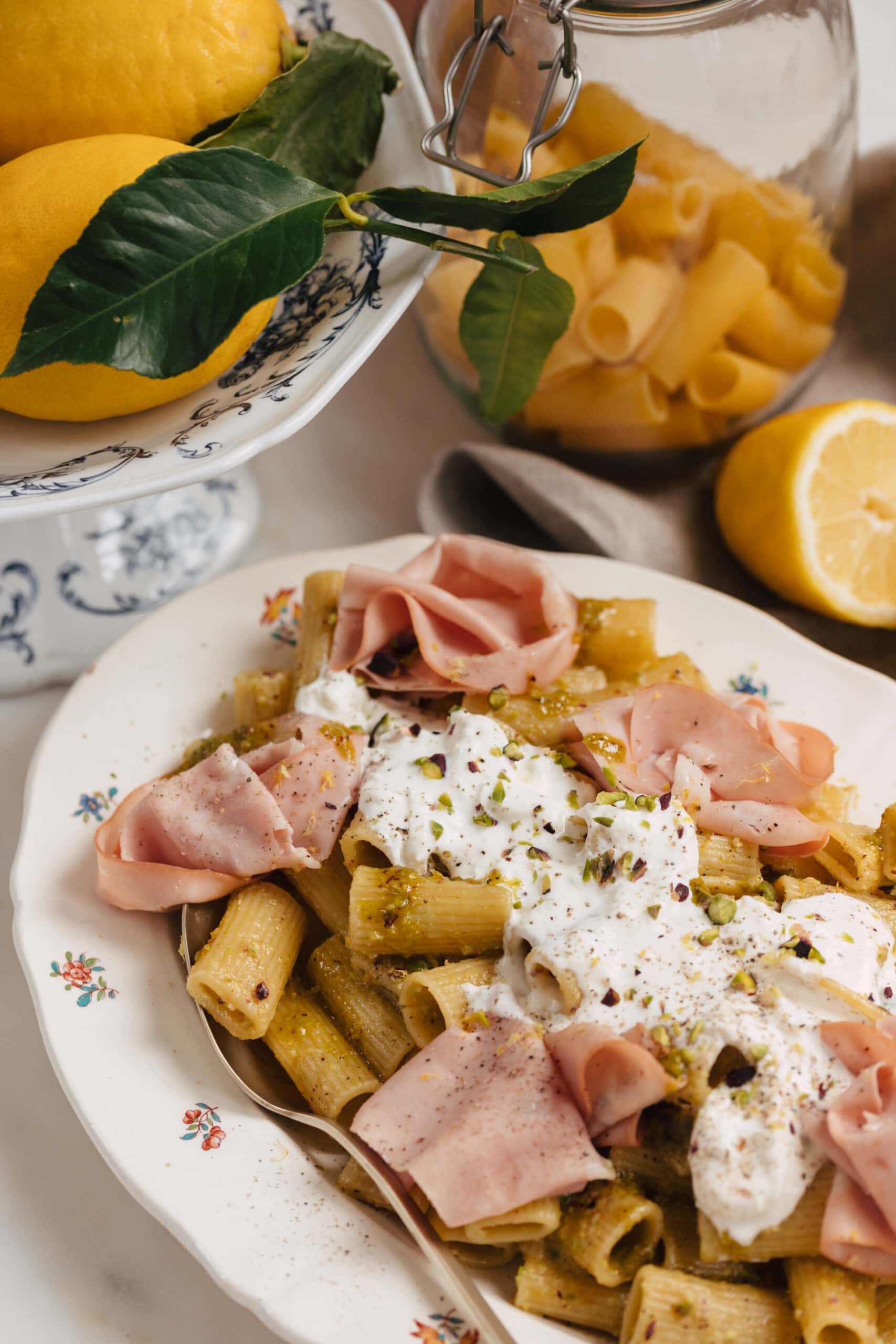 Rigatoni crème de pistache, Mortadella Bologna IGP, burrata et zestes de citrons