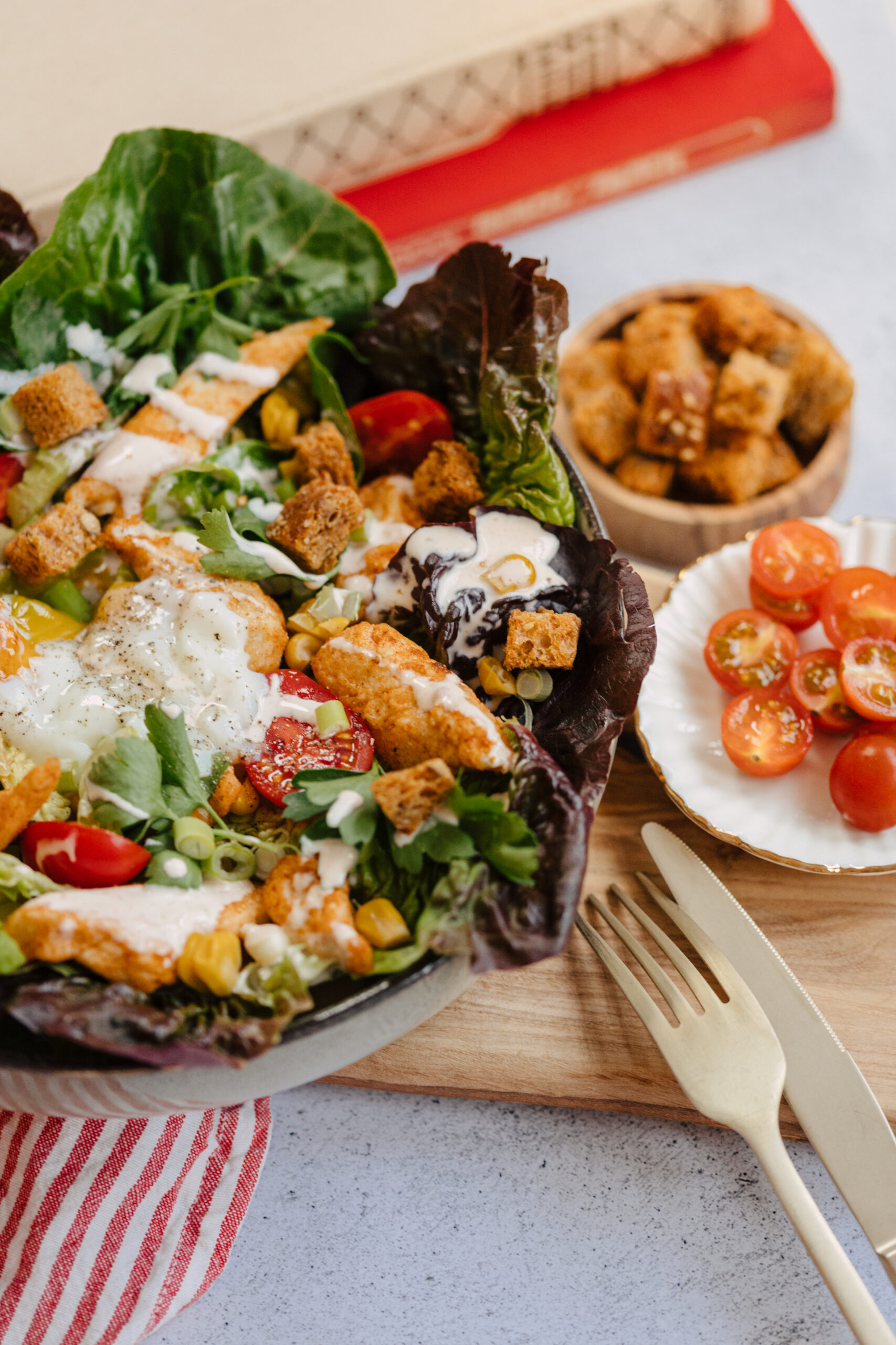• Dresser la salade avec la sauce, les croutons, le poulet taillé en petits morceaux, parsemer de maïs, tomates cerises et jeunes oignons.