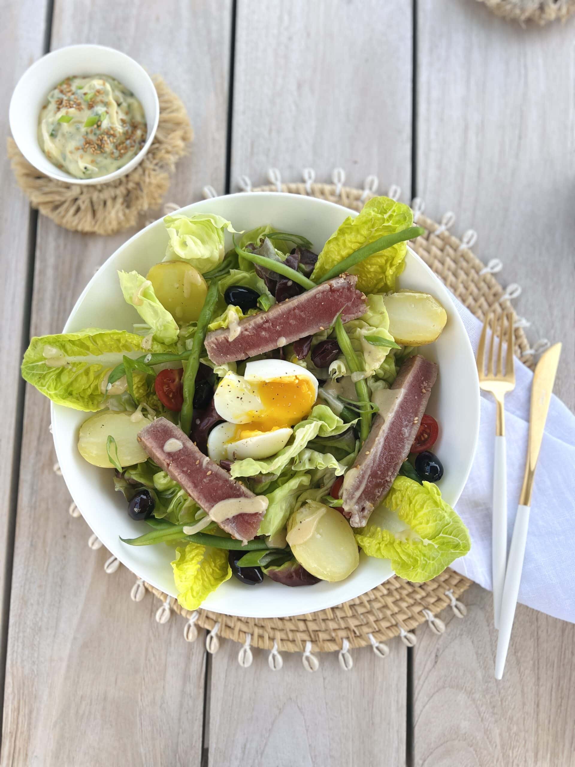 - Verser un peu de vinaigrette, ajouter le thon et l’œuf mollet.