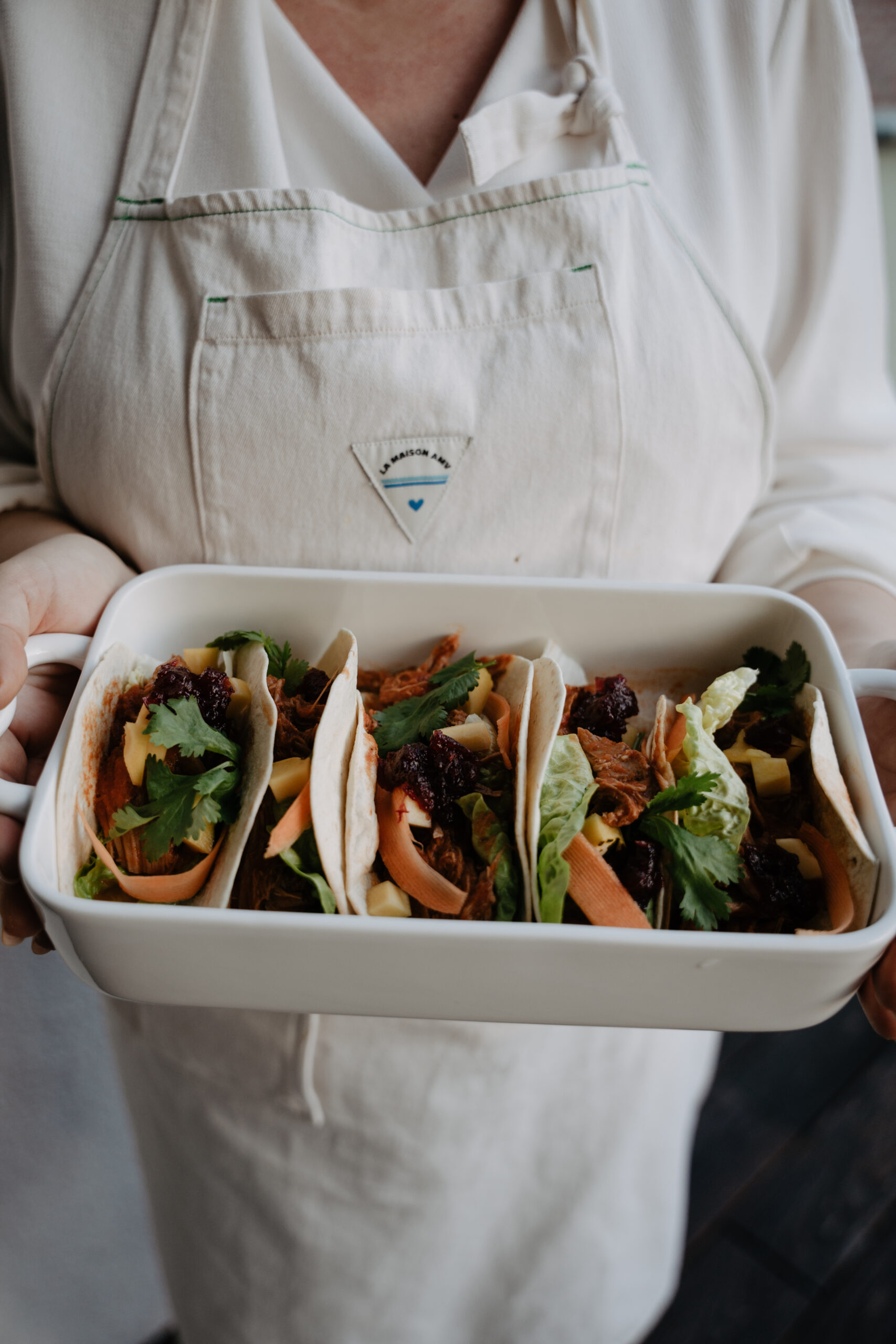 - Dresser l’agneau irlandais effiloché bien mélangé dans la sauce, dans les tacos, garnir de sucrine et de légumes pickles.