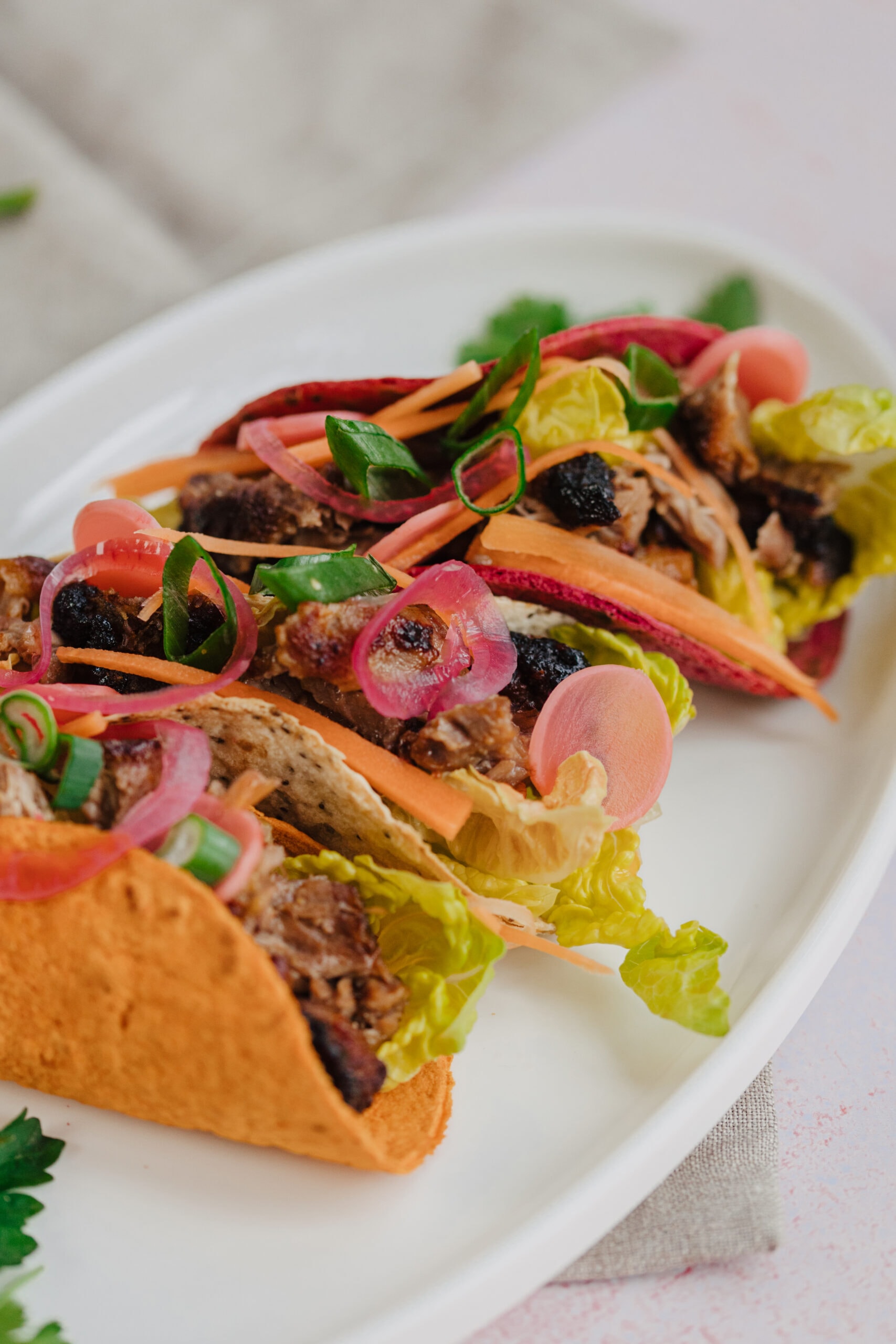 • Garnir les tacos de joues de porc, d’une feuille de sucrine, des légumes pickels et déguster.
