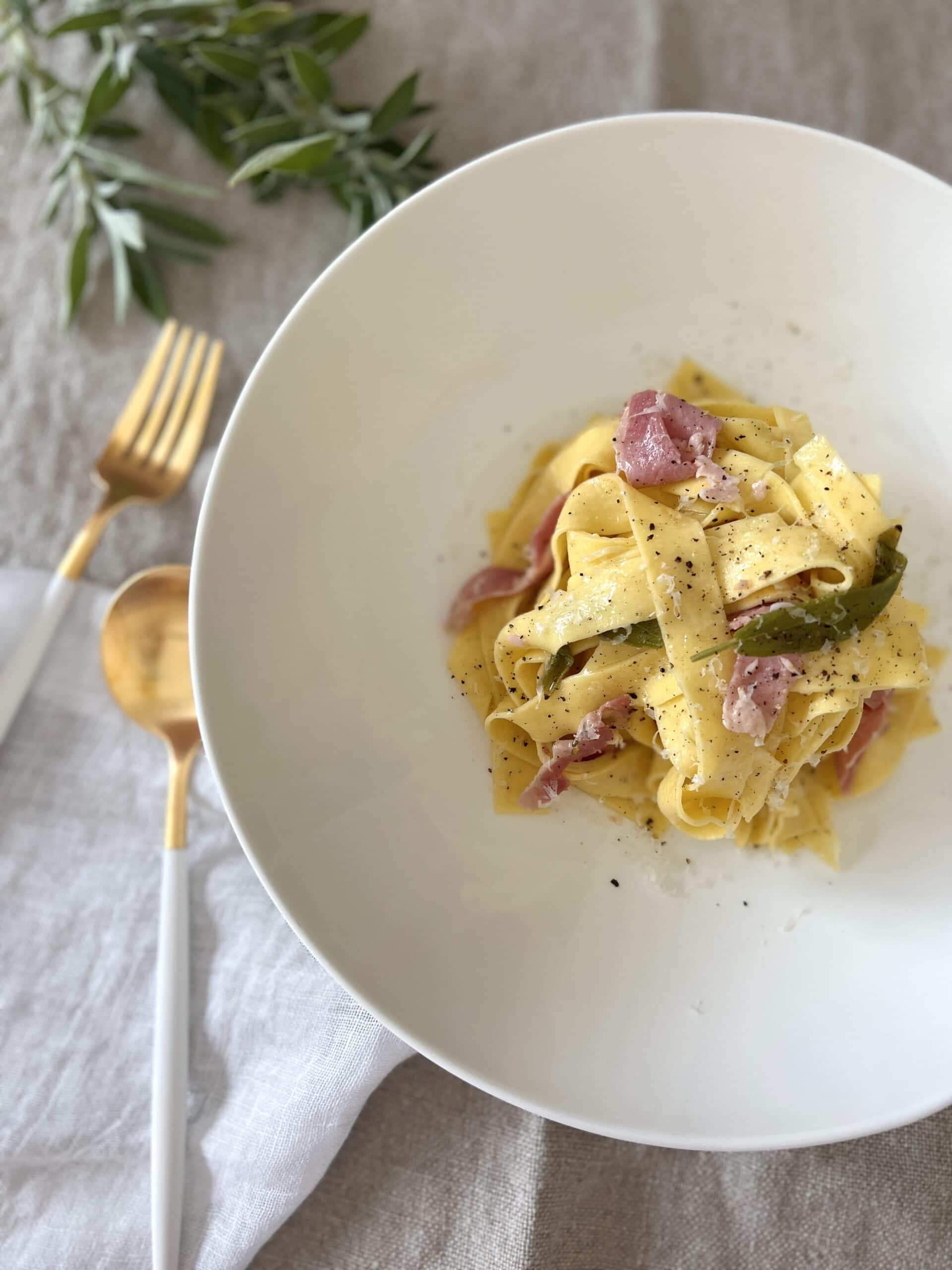 Voici une recette de pâtes très simple, très rapide et délicieuse : des tagliatelles jambon et beurre de sauge. C’est une recette qui ne nécessite que très peu d’ingrédients.