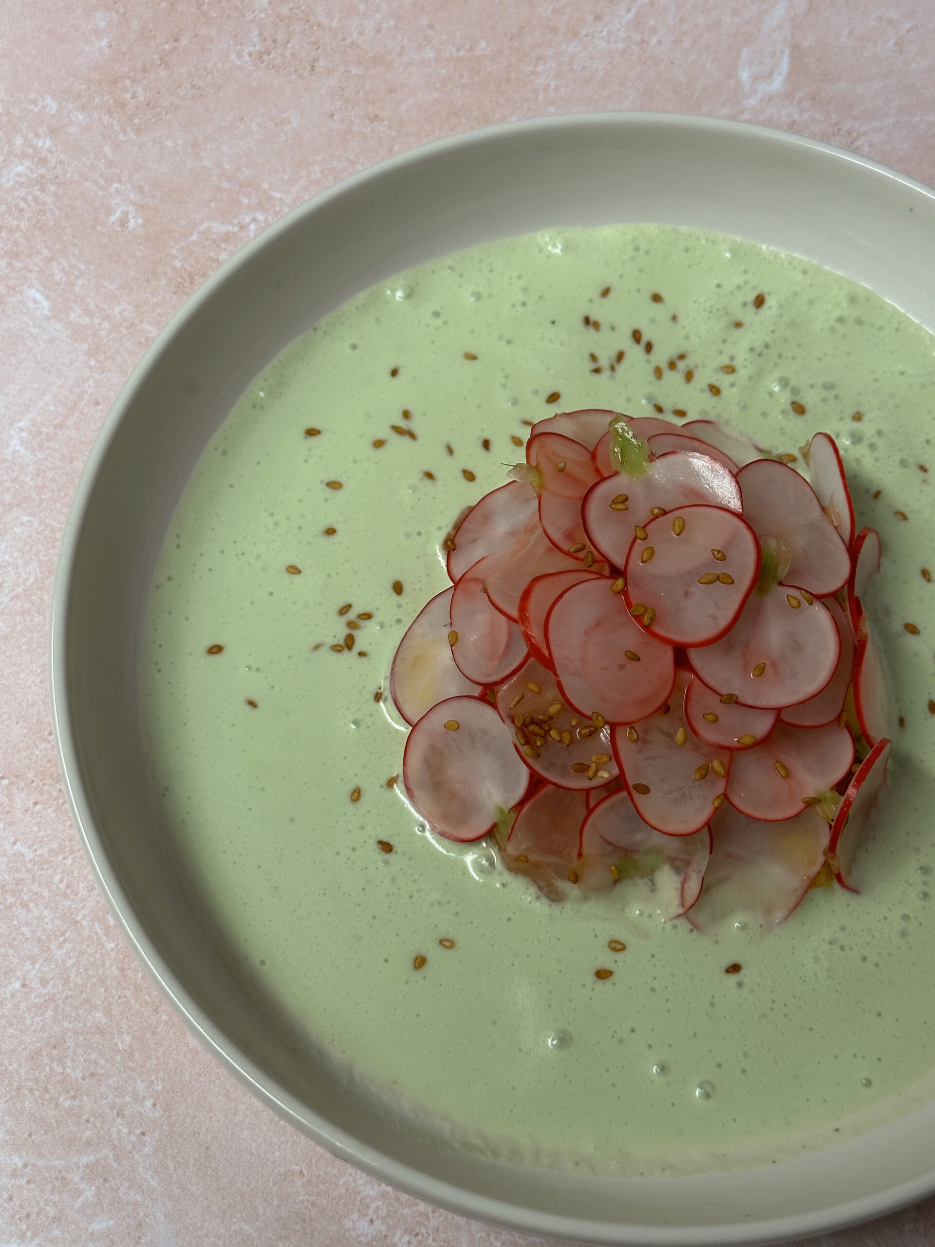 - Tailler les radis finement à la mandoline et les faire tremper dans le vinaigre de riz.