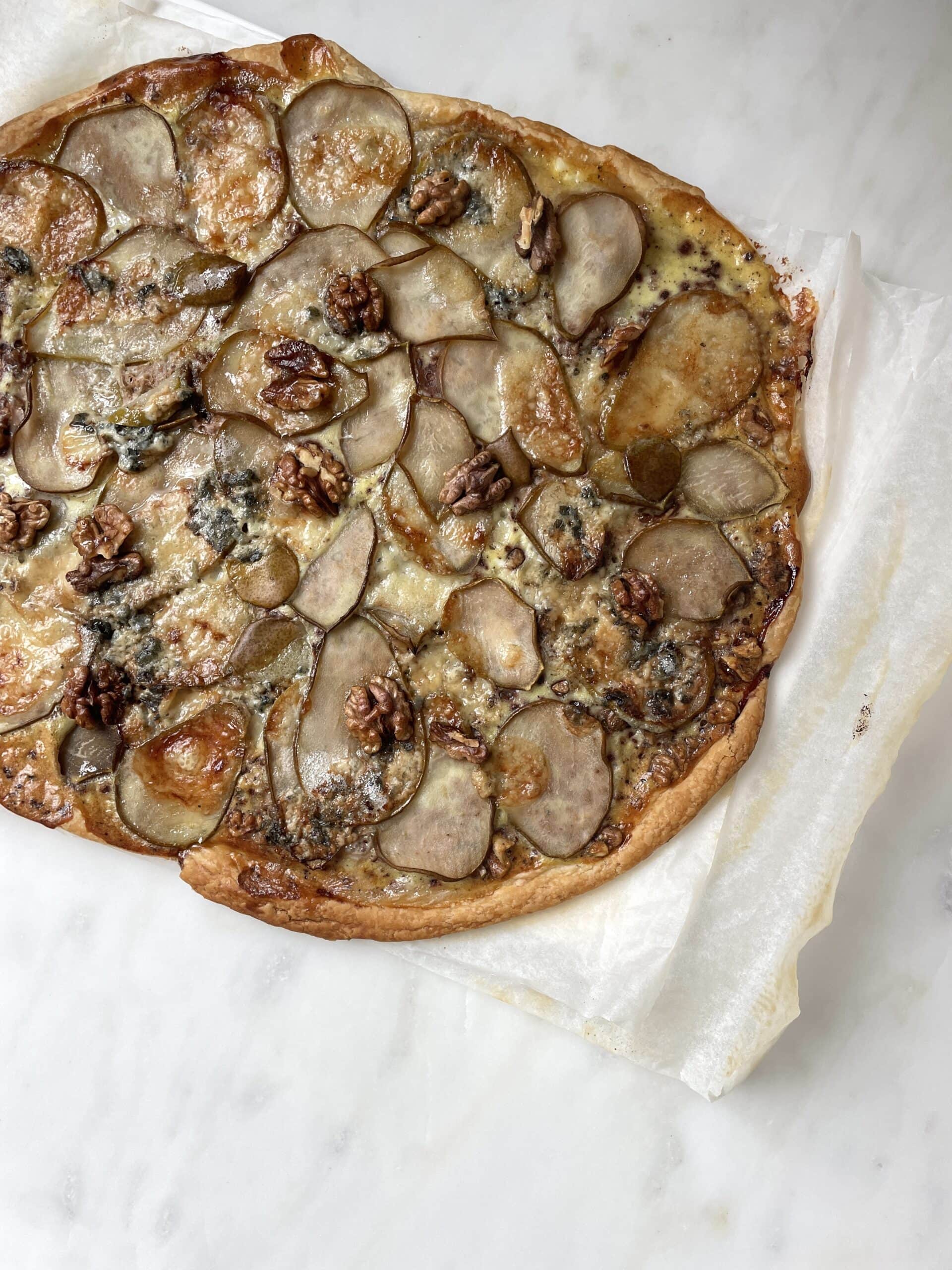 La météo se rafraîchit, il est temps pour moi de vous donner mes meilleures recettes réconfortantes ! Aujourd’hui, c’est une tarte fine avec des poires, du fromage bleu et des noix.