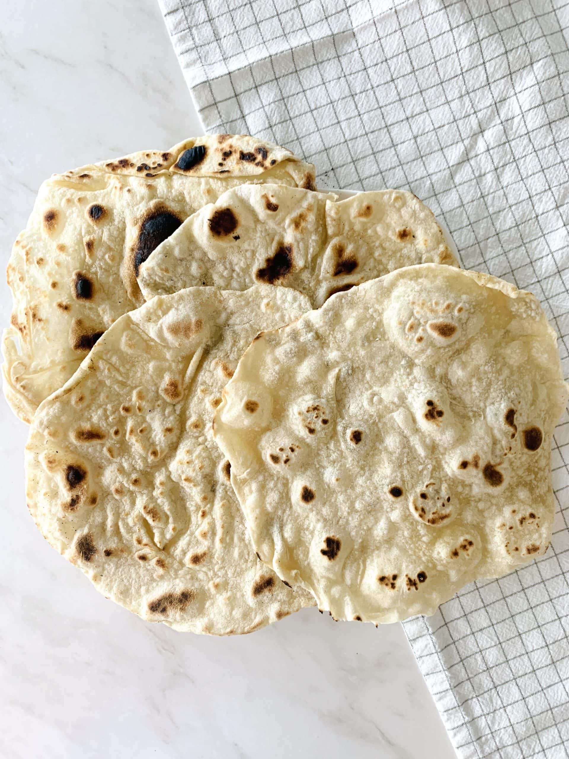 Quand les wraps sont aplatis, les prendre sur une main et tapoter pour enlever la farine. Plus il y aura de la farine, plus vite cela brûlera dans la poêle.